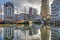 Bebouwing uit verschillende tijdperken rond het Gelderseplein in Rotterdam, waaronder het Witte Huis, weerspiegelt in het rimpelloze water van de Oude Haven.