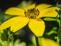 Close-up van een gele bloem. de bloem is in het midden scherp, waar de meeldraden van de bloem zicht bevinden.