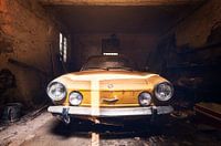 Dit is een foto van een gele Fiat die is achtergelaten in een garage. De garage hoort bij een verlaten villa die op een groot terrein in Italië staat. De deuren naar de garage zijn met een ketting afgesloten waardoor er niemand binnen kan komen. Een foto door de deuren heen was gelukkig wel mogelijk.