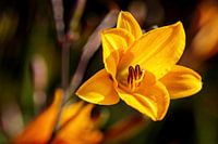 Close-up van de bloem van een gele Lelie met duidelijk zichtbare stamper en meeldraden.