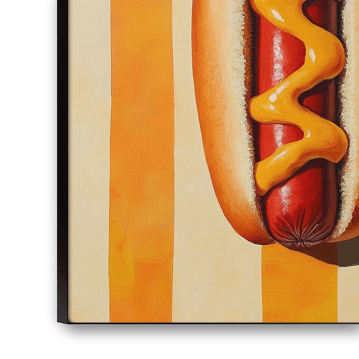 Gele Mosterdstreep - Dit realistische schilderij toont een hotdog met een felrode worst, geel mosterdsaus, en omringd door een broodje, gepresenteerd tegen een achtergrond van verticale geel en oranje strepen.