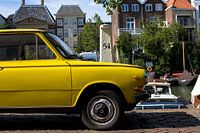 Deze prachtige Oldtimer met op de achtergrond Dordrecht