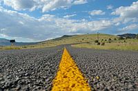 Een letterlijk low angel shot, met de typische gele lijnen die men in Amerika gebruikt. In de verte op de berg het McDonald Obervatory, de sterrenwacht van Texas.