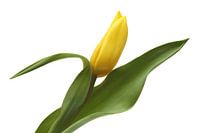 Een close-up van een gele Tulp tegen een witte achtergrond. Tulpen zijn schitterende bloemen, mooi op een vaas en in de tuin.