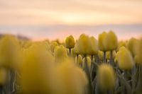 De opkomende zon verschuilt zich achter één van de gele tulpen.