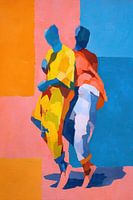 Gele Vrouw | Vibrant Connection in Motion - Dit schilderij toont een stijlvol duo van twee figuren in levendige kleuren, waarbij de vrouwelijke figuur een gele outfit aanheeft en de mannelijke figuur een oranje top, tegen een achtergrond van pastelkleuren die energie en beweging uitstralen.