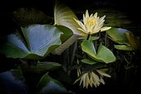 De gele waterlelie groeit tussen groene bladeren van verschillende grootte en wordt weerspiegeld in het water. Een compositie van verschillende elementen en maten die een mooi totaalpanorama vormen met een stralend gele waterlelie als blikvanger. De zwarte achtergrond maakt het ingetogen en elegant.