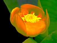Gele Waterlelie in een vijver, omringd door groen blad en digitaal bewerkt tot oranje, bijna doorzichtige, lelie.