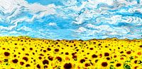 Mooie gele zonnebloemen met blauwe lucht. Impressionistisch werk met mooie felle kleuren. Dit bloemenveld zal de woonkamer, slaapkamer of keuken een heel warm en gezellig gevoel geven. Het is gemaakt in een impressionistische stijl zoals zoeken van van Gogh. Het geel met blauw geeft een mooi contrast. En dit vrolijke werk is een blikvanger.