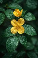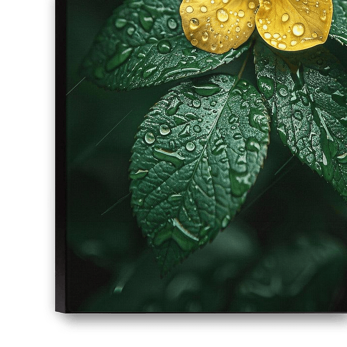 Dompel jezelf onder in de betoverende schoonheid van dit kunstwerk, waar de natuur tot leven komt in een symfonie van kleuren. Een delicate gele bloem bloeit trots, haar fluweelzachte bloemblaadjes versierd met glinsterende dauwdruppels. De levendige groene bladeren vormen een weelderig decor, hun oppervlak een canvas voor de regendruppels die als kleine juwelen schitteren. Dit kunstwerk is een viering van de eenvoudige elegantie van de natuur, een herinnering aan de vluchtige schoonheid die ons omringt. Breng de sereniteit van een regenachtige dag in huis en laat je inspireren door de delicate details van dit meesterwerk.