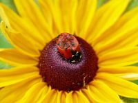 Gele bloem met lieveheersbeestje dat een beetje gehavend is. Het heeft nog een hele tijd zo in die bloem overleefd