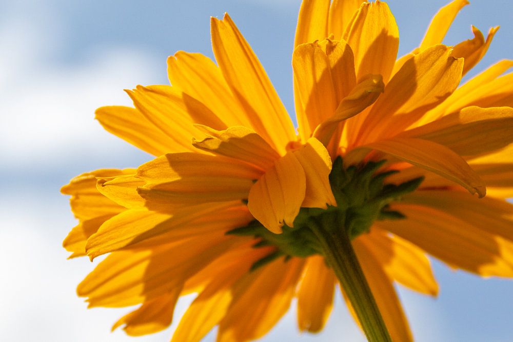 Gele bloem tegen een blauwe lucht met wolken.