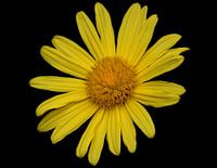 Gele bloem tegen een zwarte achtergrond in zonlicht.Deze bloem is gefotografeerd met een macrolens op statief voor een beeldvullende opname.