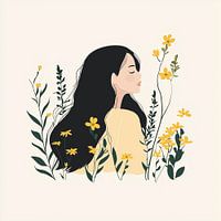 Minimalistische illustratie van een vrouw met lang donker haar, omringd door gele bloemen en groen gras. De voorstelling is opgebouwd uit eenvoudige vormen tegen een witte achtergrond en uitgevoerd in een vlakke 2D-stijl.