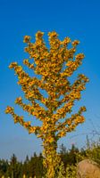 Gele bloemenboom tijdens zonsondergang in het bergdorp Bansko in Bulgarije.