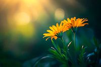 Twee stralend gele bloemen steken zachtjes af tegen de wazige achtergrond terwijl ze omhuld worden door gouden licht. Hun levendige kleurintensiteit brengt frisheid en vreugde in de kamer. Deze foto is perfect voor de woonkamer en creëert een uitnodigende en harmonieuze sfeer die het leven van alledag opfleurt.