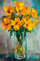 Een stralend boeket felgele bloemen ontvouwt zich in een glazen pot alsof het door de zon zelf is gevangen. De penseelstreken dansen in levendige kleuren, terwijl de zachte sfeer op de achtergrond de frisheid van de bloesems benadrukt. Een harmonieus samenspel van licht en kleur dat lentegevoelens opwekt en levensvreugde uitstraalt.