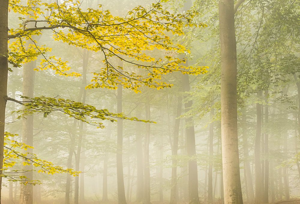 Mistige ochtend in het bos, waar de verkleuring zichtbaar word. mooi landelijk tafereel