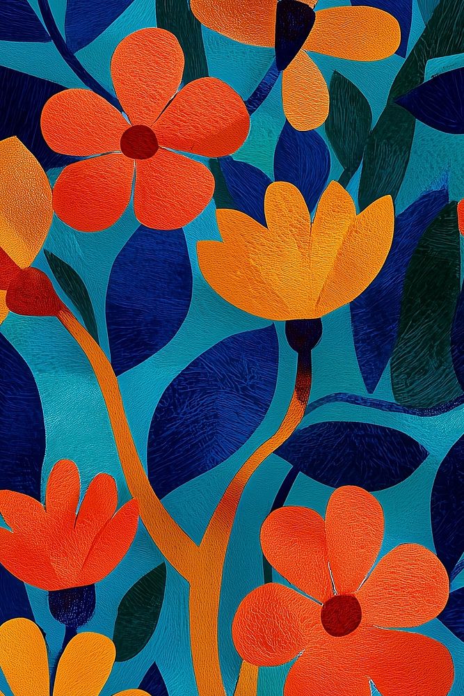 Gele en Oranje bloemen die groeien in een Boom - de bladeren van de boom zijn donkerblauw en donkergroen. De turquoise achtergrond laat de verzadigde bloemen en bladeren goed tot hun recht komen. Het doet me denken aan de geschilderde stijl van Henri Matisse, een van mijn favoriete schilders. Er zijn veel details te zien in het schilderij in de vorm van kleurverlopen en penseelstroken. Ik word er blij van - jij ook?