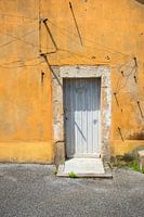 Gele gevel met subtiel lijnenspel in Franse stad . Sfeer in huis met dit zonnige schaduwspel van lijntjes en deur. Sober en effectief. Stukje straatfotografie.
