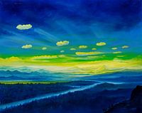 Het schilderij toont een fascinerend landschap dat de kijker boeit. Een diepblauwe lucht strekt zich uit over het hele schilderij en vormt de achtergrond voor het landschap. De geelachtige wolken die in de lucht zweven, doen denken aan pluizige wolken en geven de achtergrond een warme en uitnodigende sfeer. De horizon is zachtgeel gehouden en past harmonieus in het geheel.