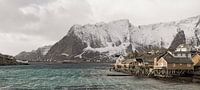 Noorse houten gele huizen houden stand in een winterstorm waarbij de wind strepen over het water trekt. Wolken razen in de verte voorbij terwijl licht en donker elkaar afwisselen.