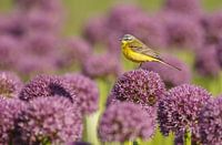 Een gele kwikstaart op een uienbol op een akker van de Nederlandse bollenkwekers. Vaak zie je deze vogels afgebeeld op de Hollandse tulpen mar dit keer op de mooie bloem van de uienbol
