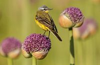 Een gele kwikstaart op een uienbol op een akker van de Nederlandse bollenkwekers. Vaak zie je deze vogels afgebeeld op de Hollandse tulpen mar dit keer op de mooie bloem van de uienbol