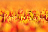 De gele kwikstaart zit in avondlicht op de geel oranje tulpen in een Nederlands tulpenveld.