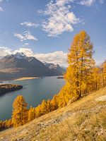 Mooie herfstdag bij het meer van Sils in het Engadin in Zwitserland. De zon laat de herfstige gele lariksen gloeien.
