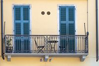 Deze sfeervolle foto toont een charmant balkon tegen een warme, okergele muur met daarin twee deuren met klassieke, blauwe houten luiken. Het balkon is voorzien van ambachtelijk zwart smeedijzeren hekwerk. Een kleine ronde tafel met twee stoelen nodigt uit tot een kopje koffie in de zon. Een groene potplant voegt een vleugje natuur toe aan de stedelijke setting. De combinatie van kleuren, schaduwen en texturen roept een gevoel op van mediterrane rust, even lekker wegdromen op een zonnige ochtend in een Zuid-Europees straatje.