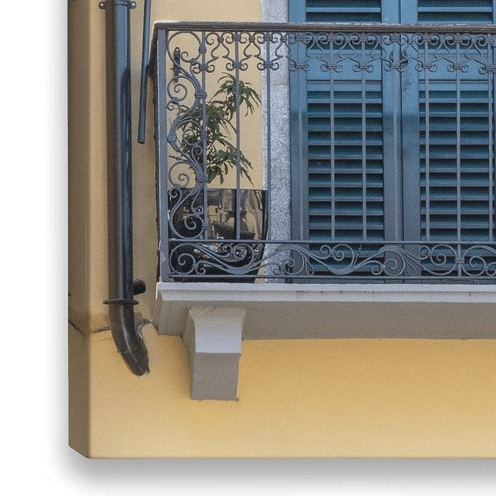 Koop de foto Gele muur met balkon van Photography art by Sacha als print op canvas, aluminium dibond, (ingelijste) fotoprint, behang en ArtFrame. Voor jou op maat geprint in Fine-Art kwaliteit.