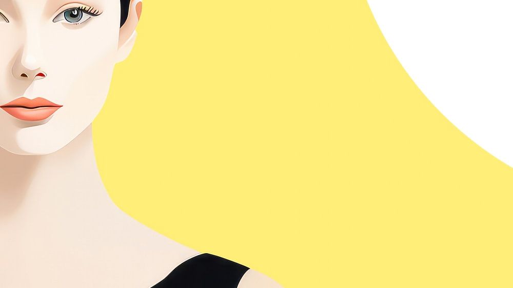 Een minimalistisch portret van een vrouw in een zwart topje, tegen een felgele achtergrond, met een zachte witte cirkel discreet geplaatst in de rechterbovenhoek, die doet denken aan de zon of de maan, wat de afbeelding een extra tintje geeft.