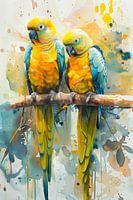Twee papegaaien in de stijl van een aquarelschilderij.