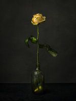 Deze fotografische stilleven toont een enkele roos in een eenvoudige glazen fles. Door het schilderachtige gebruik van licht en schaduw en het subtiele clair-obscur krijgt het beeld een verstilde, bijna tijdloze uitstraling.