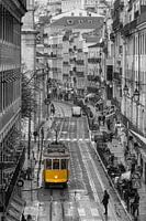 Een mooi straatbeeld uit Lissabon, met een characteristic gele tram. Dit is het uitzicht op de Rua de São Paulo, gezien vanaf de Rua Alecrim.