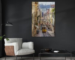 Typische gele tram in het heuvelachtige centrum van Lissabon in Portugal.