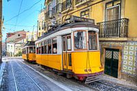 Prachtige opname van een traditionele gele tram in de smalle steile straten van Lissabon, Portugal