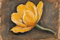 Een prachtig schilderij van een tulp in warme tinten geel en oranje. De subtiele penseelstreken en het ruwe, rustieke canvas geven een klassiek maar ook modern gevoel. Deze kunstwerkstijl past uitstekend in zowel traditionele als eigentijdse interieurs. Door de natuurlijke kleuren en het eenvoudige ontwerp brengt het een serene sfeer in de ruimte. Ideaal om aan de muur te hangen in de woonkamer of keuken voor een vleugje natuurlijke elegantie. Het schilderij roept gevoelens van rust en schoonheid op en is een perfecte aanvulling voor liefhebbers van bloemen en klassieke kunst.