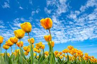 Tulpen groeien in een veld tijdens een mooie lentedag in de Noordoostpolder in Flevoland. Laag standpunt met een blauwe lucht boven het tulpenveld.