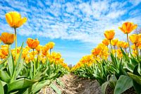 Tulpen groeien in een veld tijdens een mooie lentedag in de Noordoostpolder in Flevoland. Laag standpunt met een blauwe lucht boven het tulpenveld.