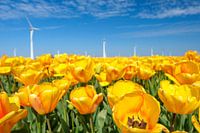 Gele Tulpen groeien in een veld tijdens een mooie lentedag in de Noordoostpolder in Flevoland met windturbines op de achtergrond. Laag standpunt met een blauwe lucht boven het tulpenveld.
