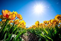 Gele tulpen in een veld tijdens een mooie lentedag in de Noordoostpolder in Flevoland, Nederland. Laag standpunt met een blauwe lucht boven het tulpenveld.