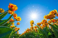 Gele tulpen in een veld tijdens een mooie lentedag in de Noordoostpolder in Flevoland, Nederland. Laag bovenaanzicht met een blauwe lucht boven het tulpenveld.