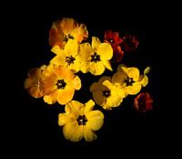 Een foto van gele tulpen op een klassieke manier met een zwarte achtergrond, De tulpen staan wijd open en aan de zijkant staan nog wat rode tulpen.