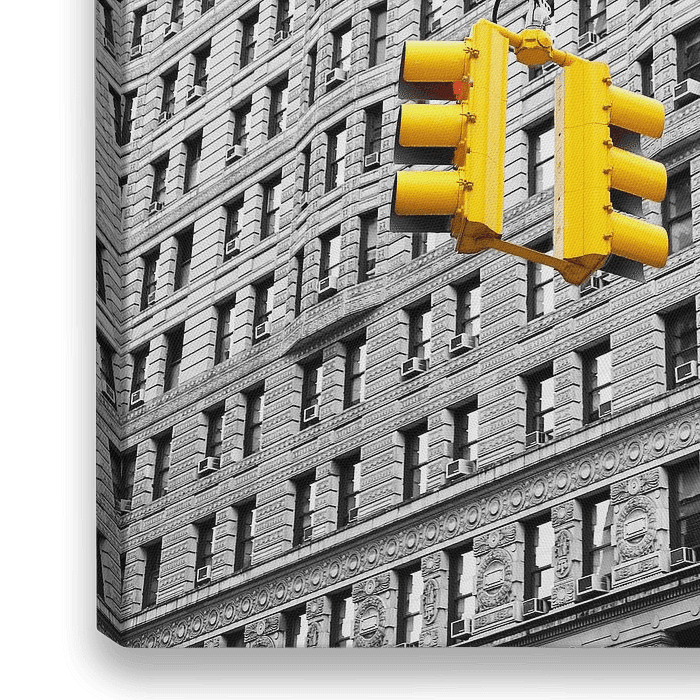 Gele verkeerslichten die contrasteren met een zwart-wit gebouw met textuur om een sterk visueel kunstwerk te maken dat echt opduikt!
