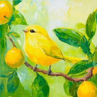 Een heldere gele kleur fleurt het tafereel op, terwijl een levendige kanarie op een tak zit omringd door sappige, gele citrusvruchten. De zachte, groene bladeren geven het beeld frisheid en leven, terwijl het harmonieuze kleurenpalet een vrolijke zomerstemming oproept. Een moment van rust in een kleurrijke, bloeiende wereld!