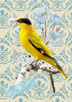 Hier zie je een kunstzinnige compositie die direct in het oog springt: een felgele vogel die schittert tegen een achtergrond van zachtblauw vintage behang. Het fotomateriaal van de vogel, met zijn glanzende veren en heldere contrasten, wordt speels gecombineerd met getekend materiaal zoals de verfijnde bloemen en de subtiele tape-details.