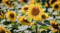 Veld met zonnebloemen in de Loire Vallei. Frankrijk, Europa. Bloem steekt boven de andere zonnebloemen uit. Zomers plaatje van het Franse platte land.