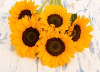 Gele zonnebloemenregeling op houten achtergrond van Alex Winter